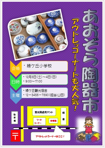 | 2023年8月18日の作品 なかちゃんの“陶器市” (使用ソフト:ワード)縦書ワードアート、地図作成、スマートアートの学習。 |