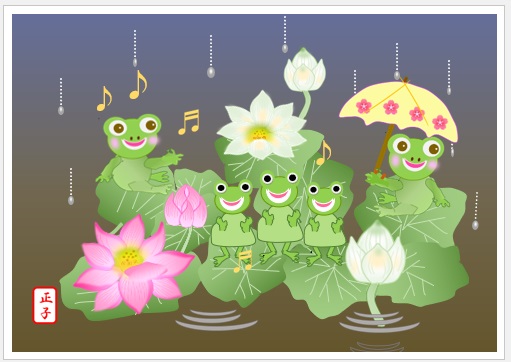 | 2024年5月20日の作品 まこさんの“蛙とハスの花” (使用ソフト:ワード) 自宅での自主学習、メールで届きました。 |