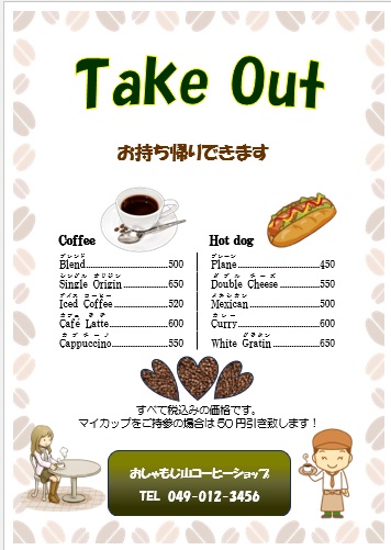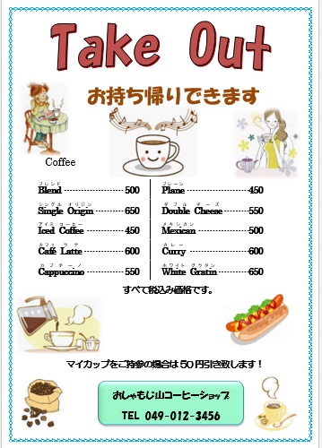 | 2024年6月14日の作品 かんちゃんの“コーヒーのメニュー” (使用ソフト:ワード) |