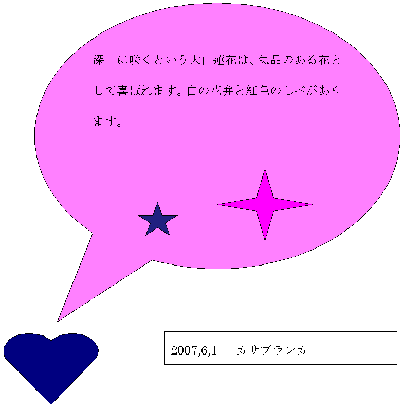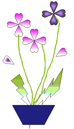 | オートシェイプのいろいろな図形を組み合わせて何かが描けるのではないかという雰囲気が高まりハートを使って花を描くことになりました。6枚の花弁を回転させて並べるのが難しかったようでしたがみごとに並べましたよね。パソコン歴4ヶ月でここまできたのですね。「上達ぶりに感服!!!!」ですよね |